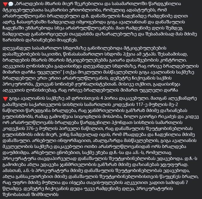 As of now, four individuals have been detained in connection with the Giga Avaliani case. One of the accused, Aleksandre Gabashvili, has been charged under Article 117, Part 2 of the Criminal Code of Georgia, which refers to intentional infliction of grievous bodily harm resulting in death.