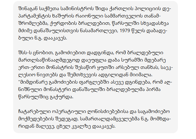 According to the MIA, the investigation established that the accused illegally took money from a donation box at one of the monasteries located in the town of Surami, stole church items, and then fled the scene.