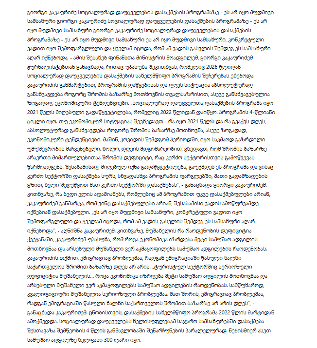 For reference, the state employment program was launched in March 2022. The government offered socially vulnerable citizens employment in public institutions while allowing them to retain their social assistance for a period of four years. The salary for any such position was 300 GEL